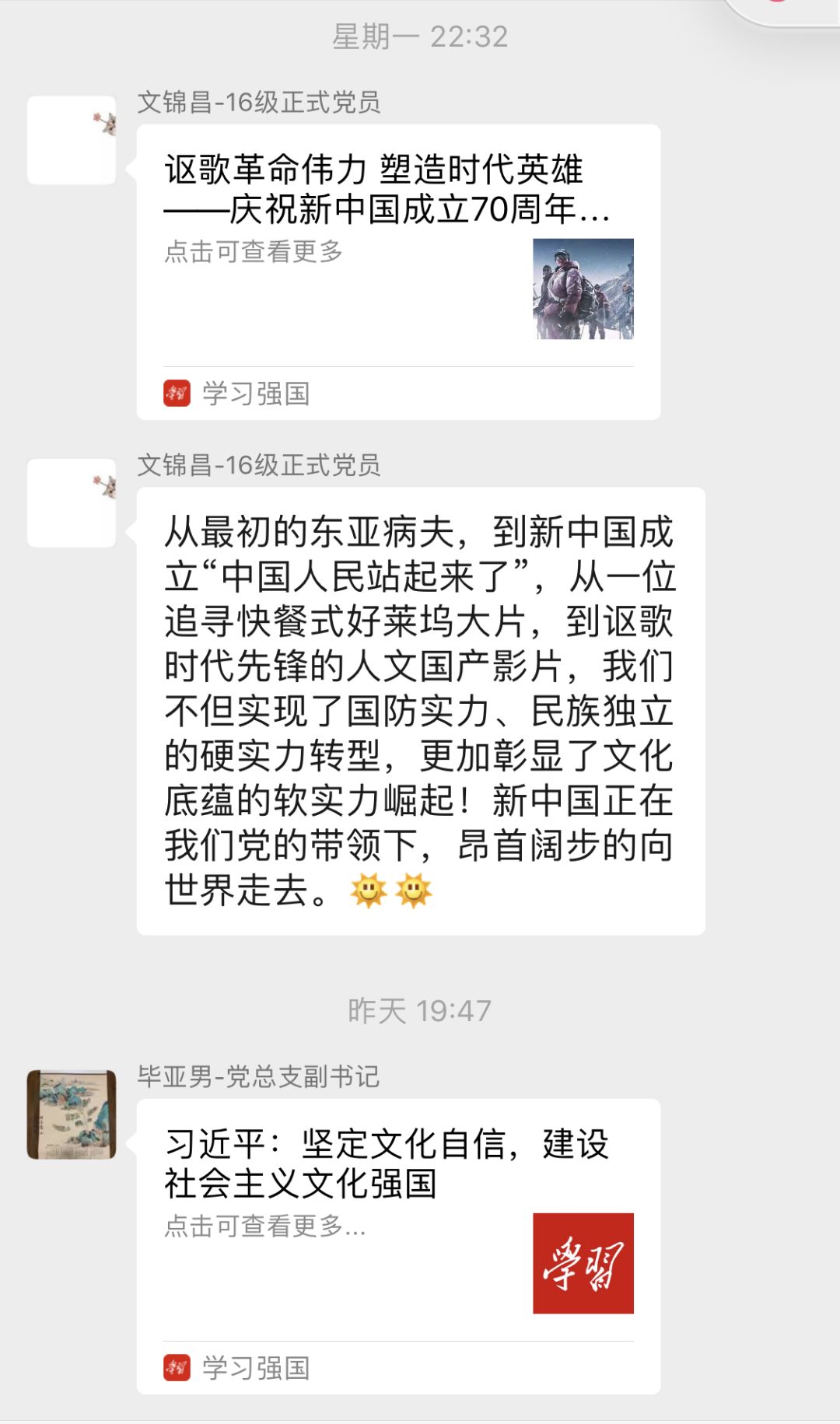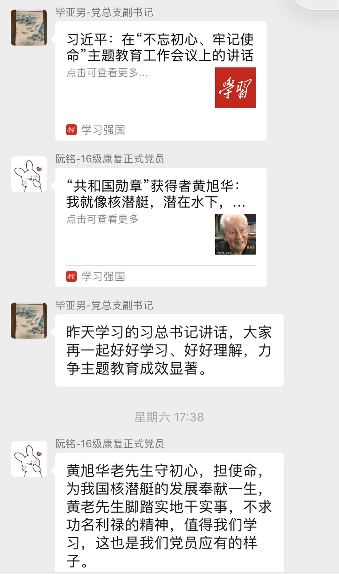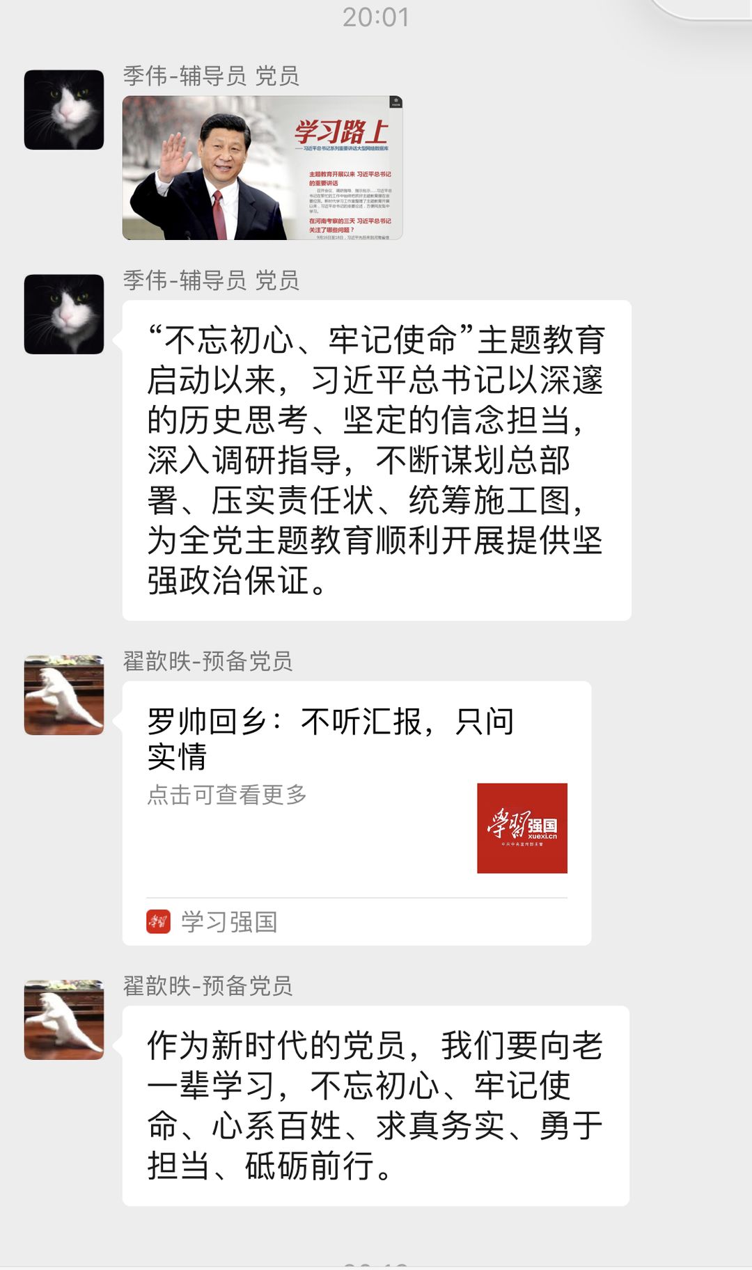 近期,999全讯白菜网学生党支部每一位党员每天自发地在群里分享个人自学《习近平关于“不忘初心、牢记使命”重要论述摘编》、《习近平新时代中国特色社会主义思想学习纲要》等主题教育学习资料的心得体会。