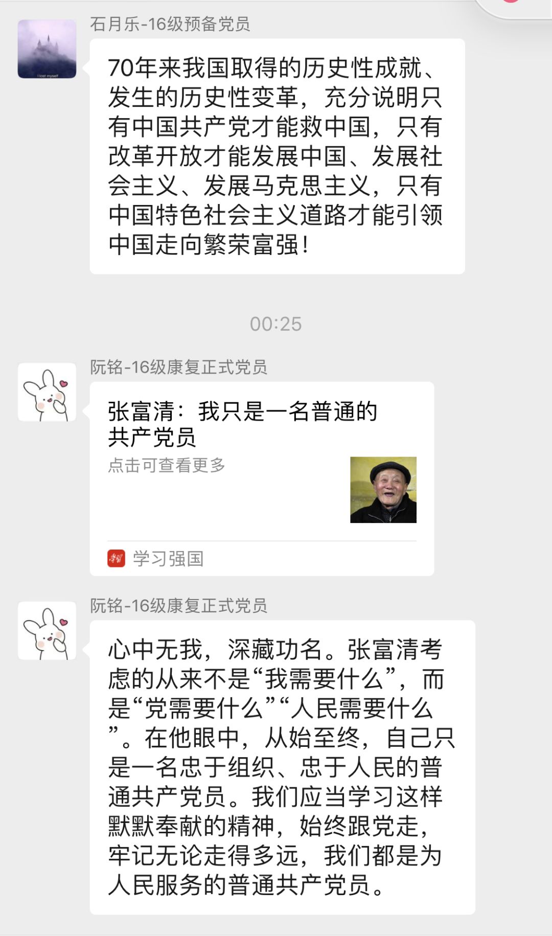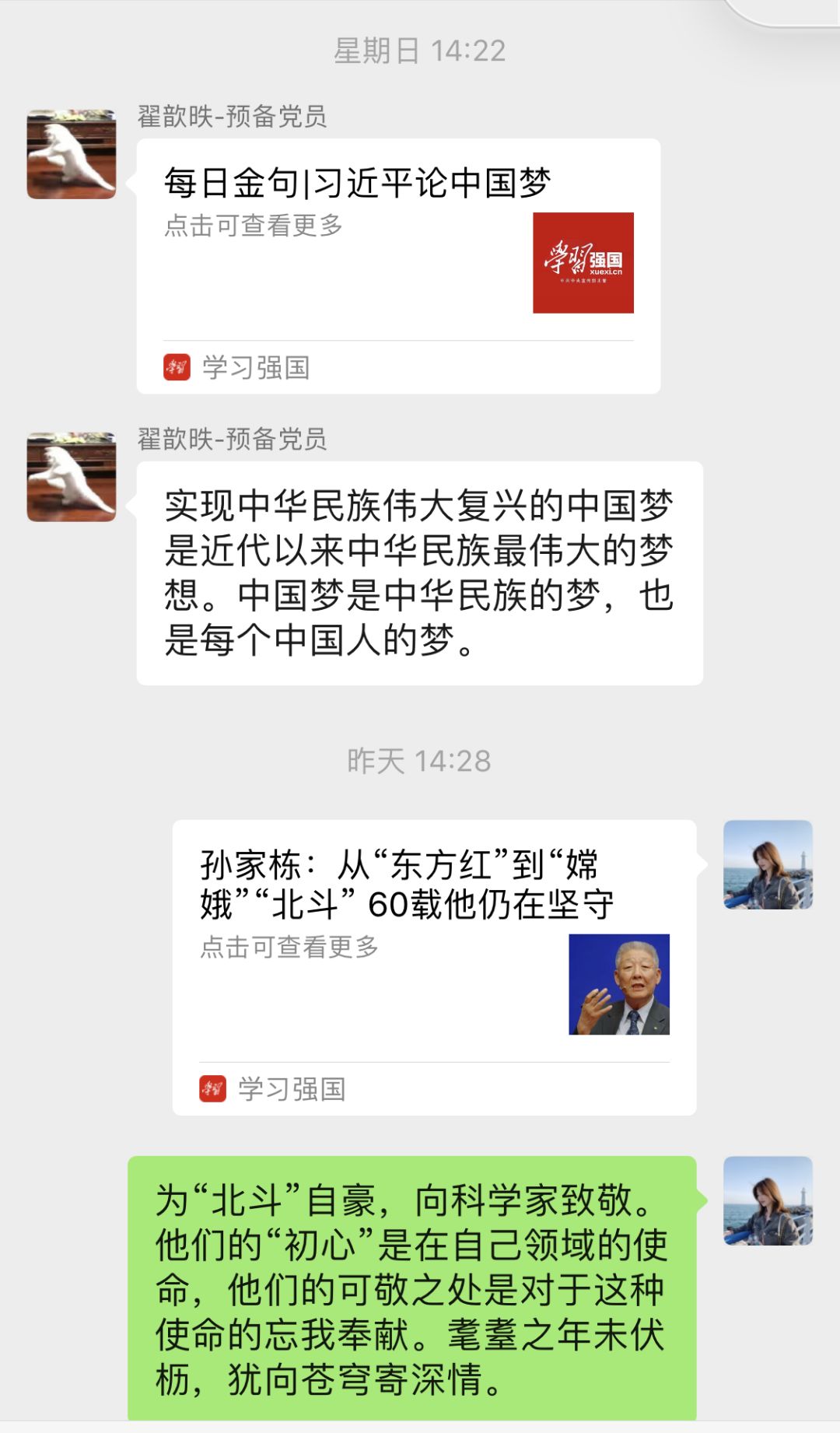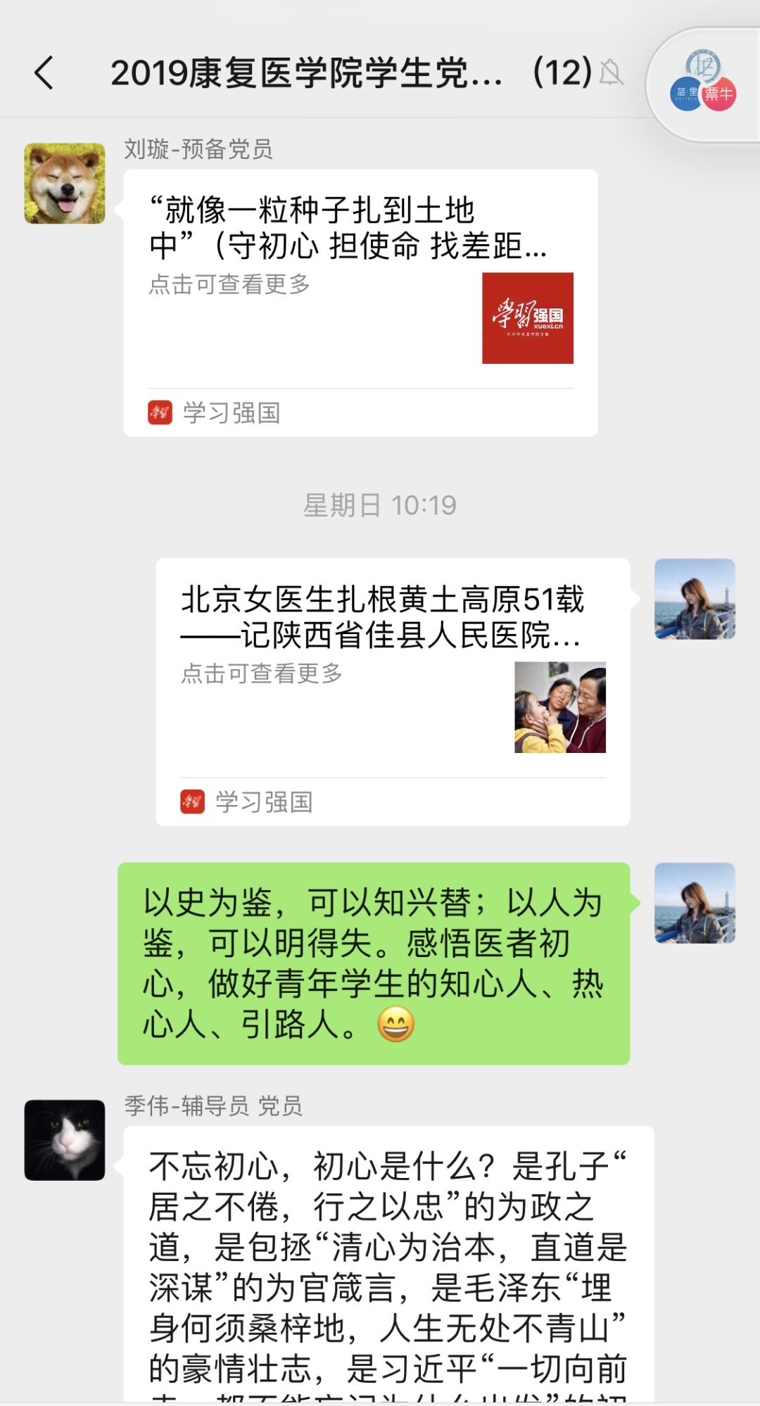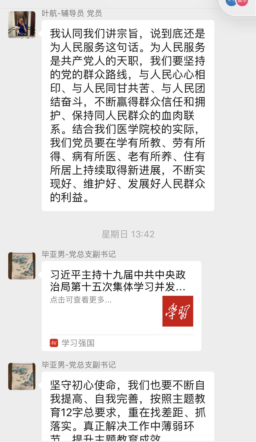 近期,999全讯白菜网学生党支部每一位党员每天自发地在群里分享个人自学《习近平关于“不忘初心、牢记使命”重要论述摘编》、《习近平新时代中国特色社会主义思想学习纲要》等主题教育学习资料的心得体会。