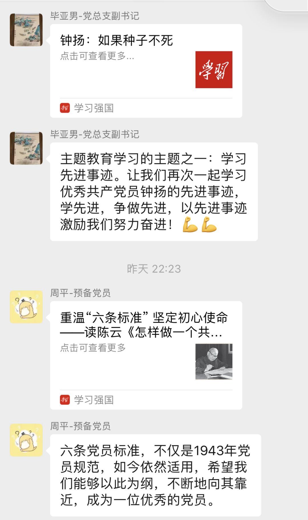 999全讯白菜网学生党支部的党员构成是以本科高年级学生党员及辅导员为主,创新学习研讨方式,既打破了主题学习的时间、空间局限;又有效利用了“学习强国”平台学习主题教育相关内容,增进了党支部成员的沟通。
