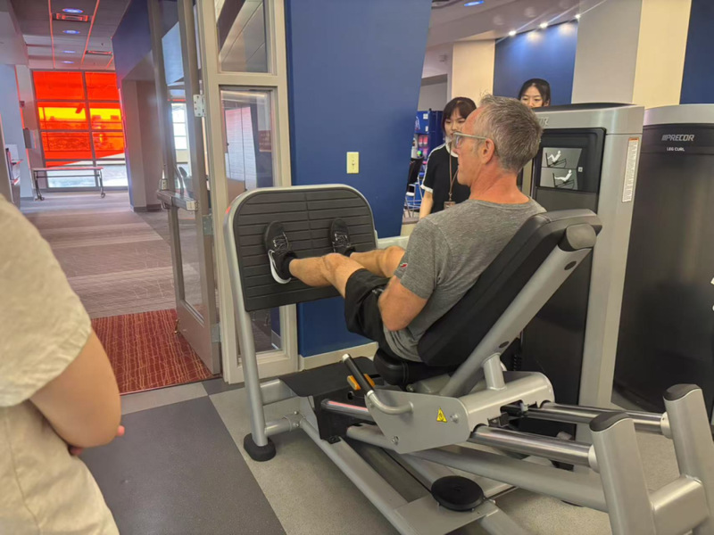 理论部分结束后,Martin教授带领全体同学前往校园中的健身房,在健身房的二楼固定器械区依次向我们介绍并亲自示范了不同固定器械的不同使用方法,随后留出时间让同学“上阵”操练。随后Martin教授又接着带领我们前往健身房3楼—自由重量区,提出问题引导同学们针对自己最喜欢的固定器械,思考其对应的自由重量训练动作。在同学们实际操练的过程中,Martin教授还会进行专业的指导和纠错。这堂课为我们已有的知识添砖加瓦,也为接下来制定运动处方打下了坚实的基础。