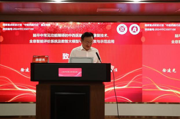 本次会议由中医智能康复教育部工程研究中心执行主任许东升教授主持。会议由中医智能康复教育部工程研究中心主任徐建光教授致开幕词,深刻阐释了项目的战略意义、实施路径与价值追求,为项目高质量推进指明方向。徐建光教授强调,脑卒中康复是康复医学的主战场,项目将以“中西医融合+智能化”为核心路径,以疗效为核心目标,探索中医药与现代科技的深度融合,是一项“方向正确、格局高远”的系统性工程。