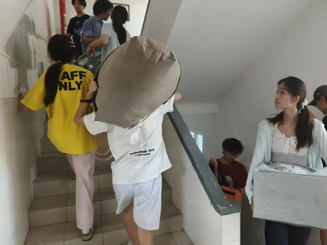高温预警下,同学们的热情和活力却丝毫未减,反而在烈日中显得更加耀眼。他们或肩扛手提,或推车搬运,汗水浸湿了衣衫,却挡不住他们前进的步伐。志愿者团队主动承担起搬运重物的责任,男同学协助女同学搬运卸载,老师们也纷纷出手帮忙。师生们不畏艰辛,经过一上午的奋战,顺利完成搬迁任务,生动诠释了劳动教育的实践精神。